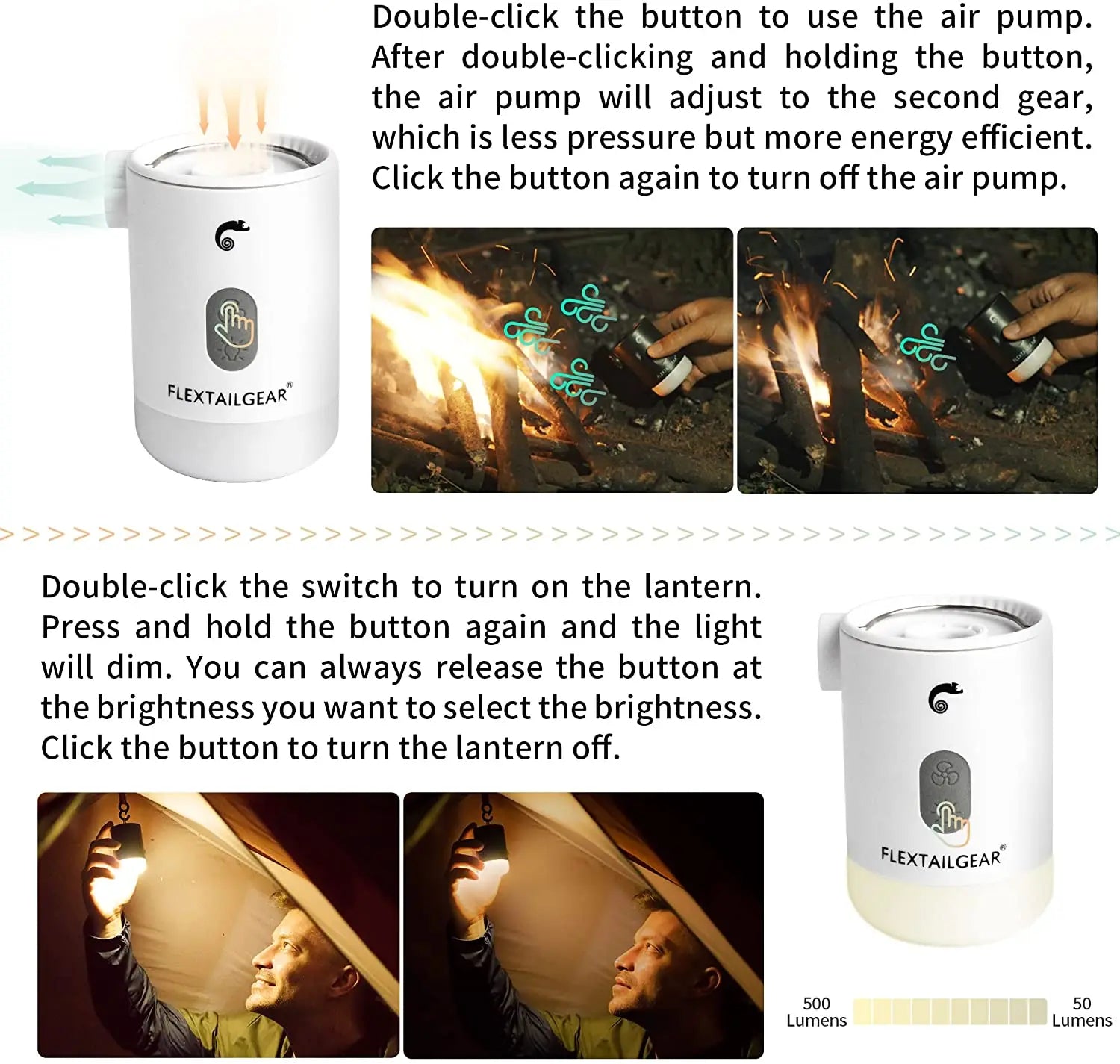 2:【Rich & Multifunctional Use】- The travel air pump contains led camping light and phone charger function. Built-in Camping light can be steplessly adjusted, you can always find the most suitable light brightness to match your environment (double click to open the light and long press to stepless adjust the brightness). Flextailgear small air pump can also be your phone charger to fill your phone once or twice (depends on the battery capacity).