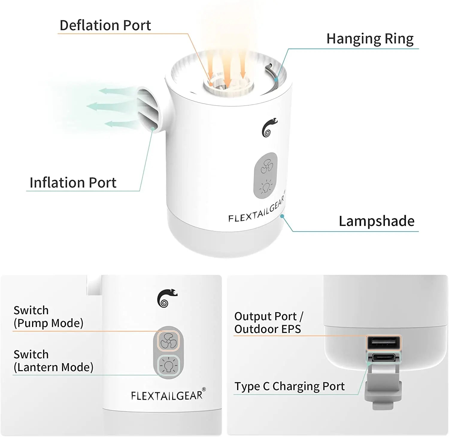 3:[Sighs]- With Large-capacity battery, our air mattress pump works up to 60 minutes during Low-Pressure Mode (30 mins on High-Pressure Mode) after fully charged. Camping light can work up to 76 hours at 50 lumens and 12 hours at 500 lumens. Type-C charing port supports 4 ways of charging: power bank, laptop, car charger, or power adapter. Convenient charging indicators: green for finished, and red for 0-99% status.
